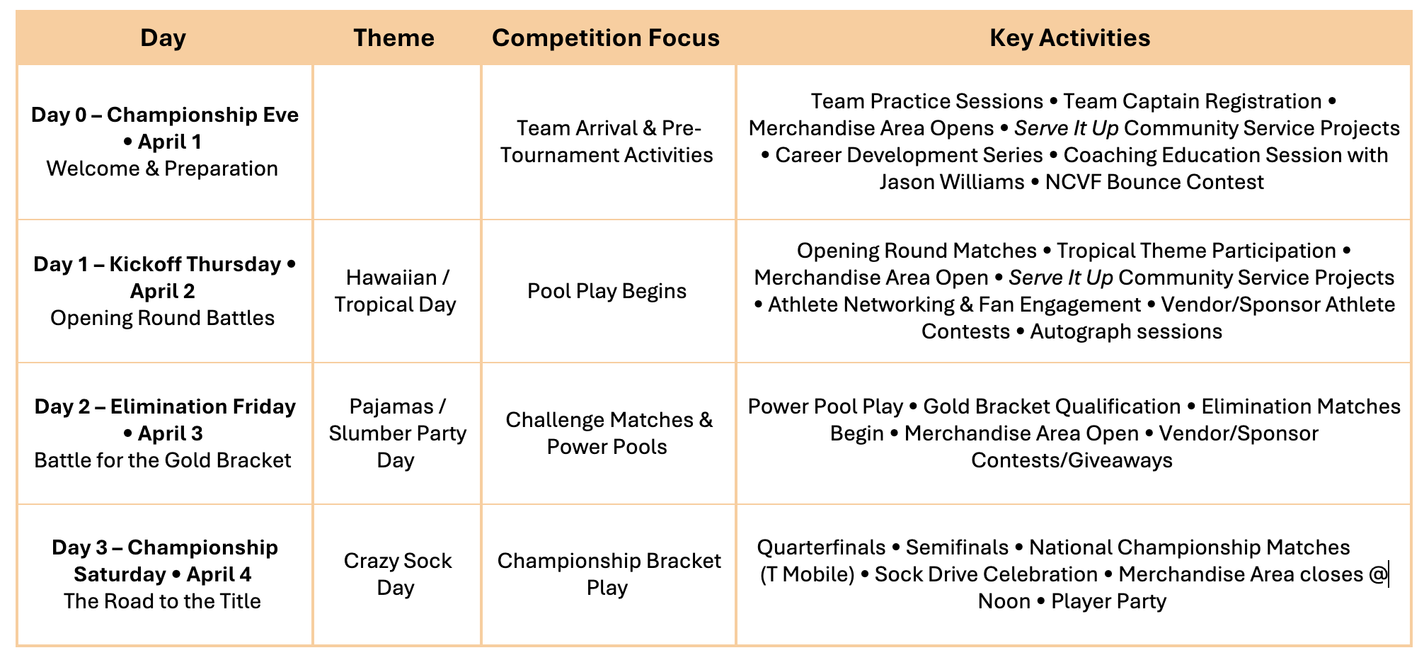 Players can take advantage of practice sessions, community service opportunities, professional development panels, coaching education, and athlete competitions before the tournament officially begins.