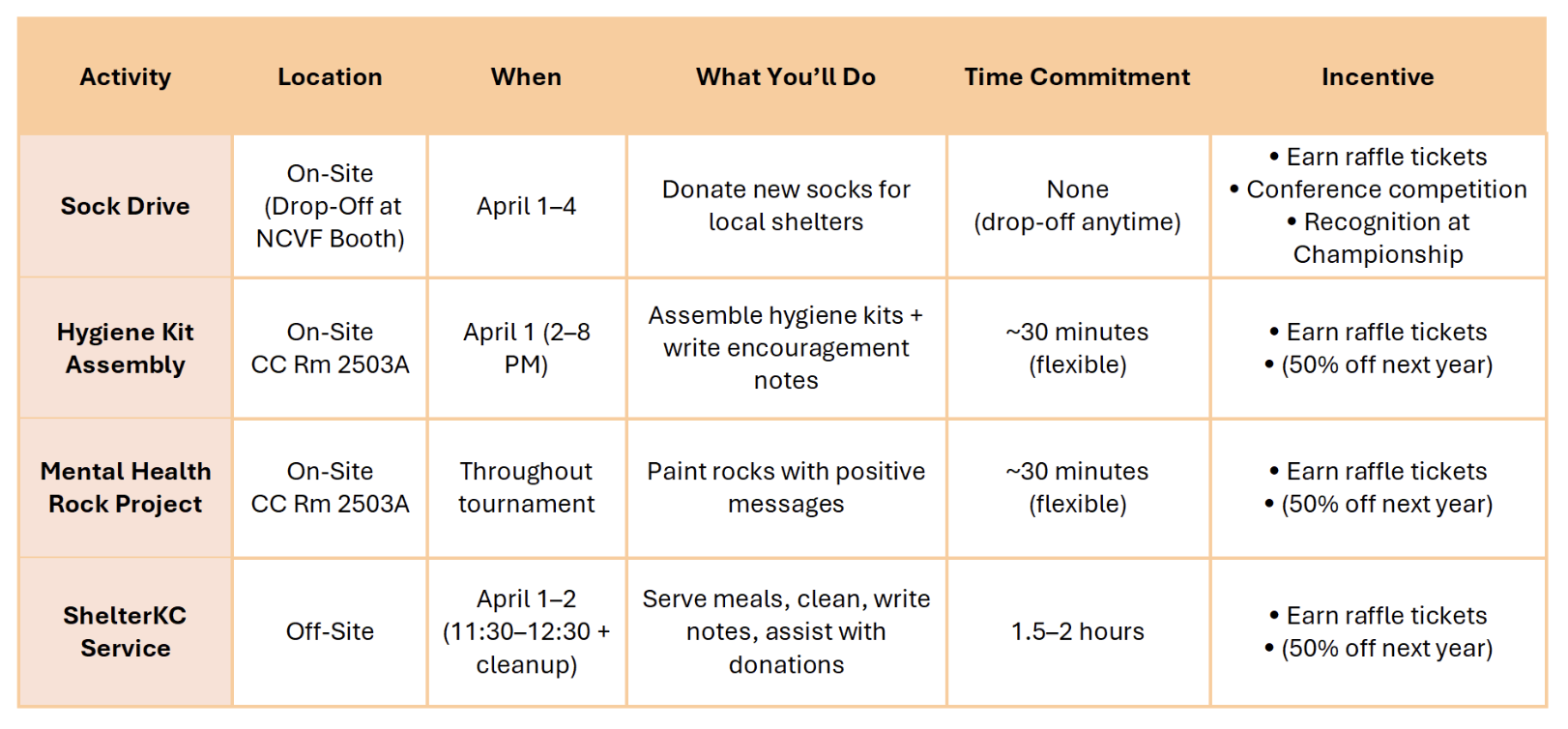 Serve It Up is your chance to represent your team, your conference, and your values by giving back to the Kansas City community. Whether you’ve got 5 minutes or a full hour, every action counts. Participants can contribute through several meaningful service activities, both on-site and off-site. These opportunities are designed to make a real impact while fitting into your tournament schedule.